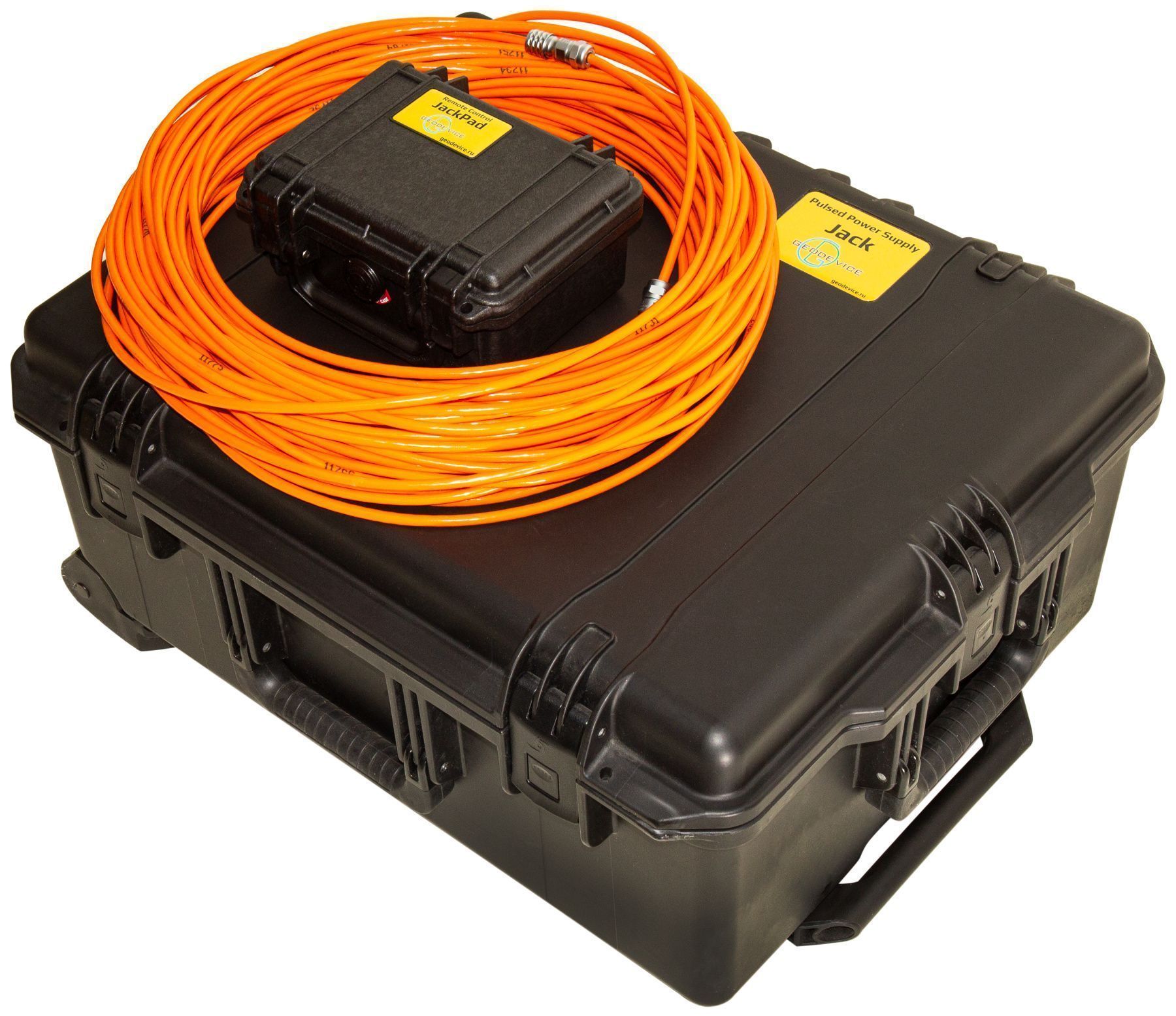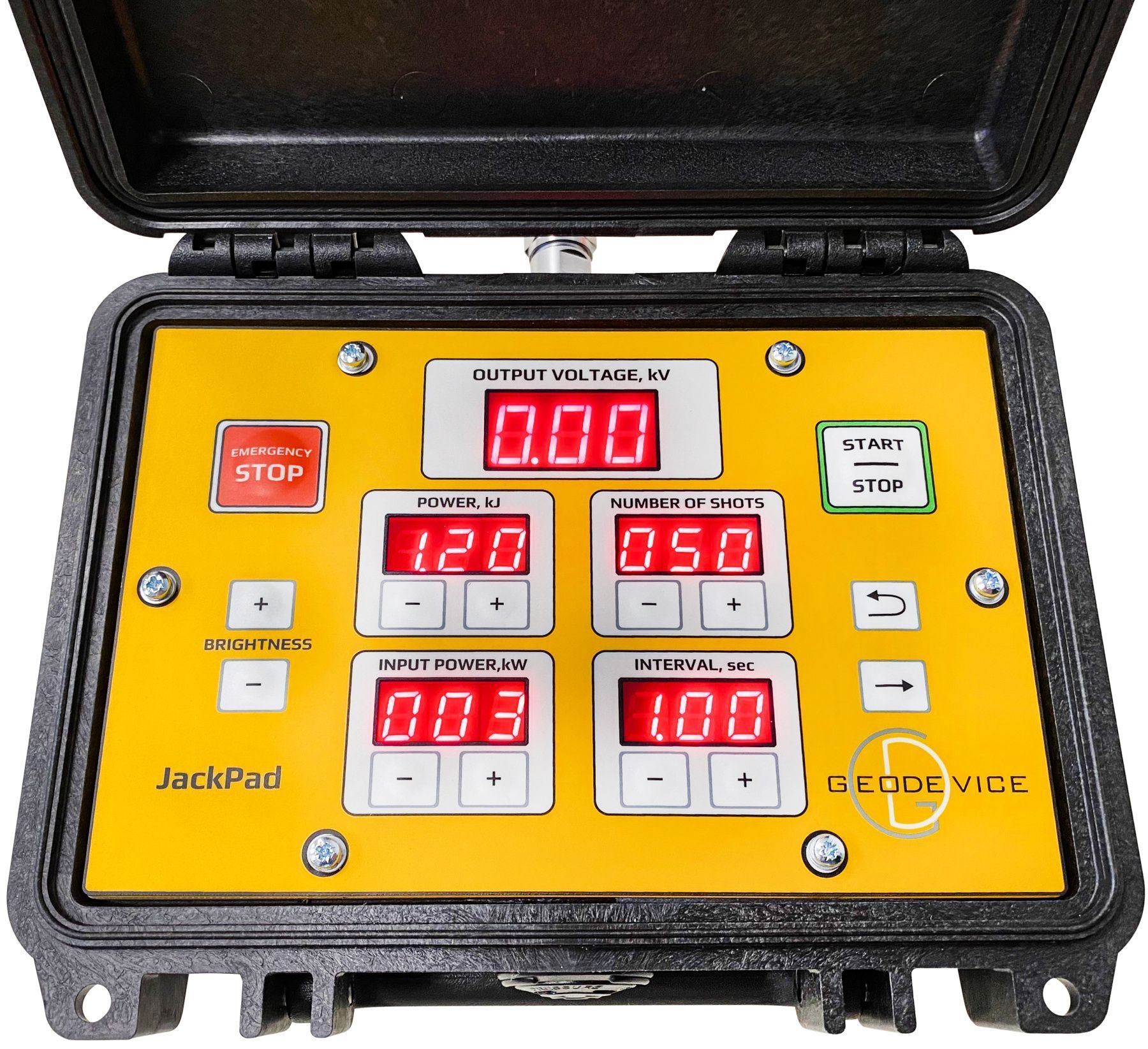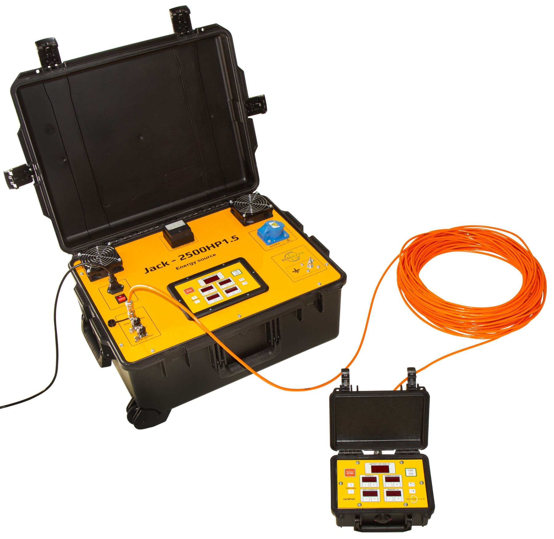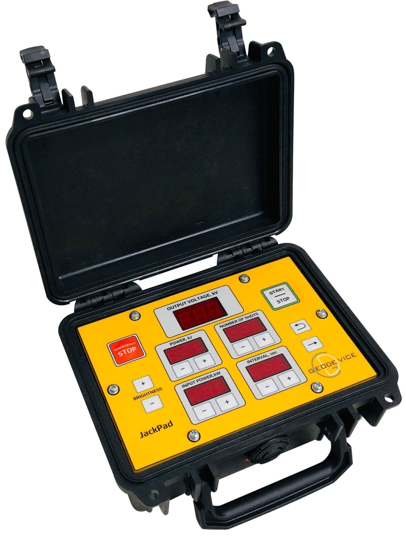 Notre panneau de contrôle Jack , pratique et intuitif, offre une grande flexibilité pour configurer le mode de tir. Il est facile de programmer le cycle avec le nombre de tirs souhaité et la période entre eux, l’énergie et la consommation électrique requises, ainsi que le déclenchement depuis une station sismique ou un système de synchronisation. L’unité de commande à distance JackPad duplique le panneau de contrôle et permet à l’opérateur de la station sismique de contrôler entièrement le système. Il est important de souligner que le JackPad assure également une sécurité supplémentaire lors des opérations.
